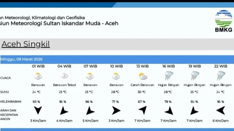 RRI.CO.ID, Singkil - Badan Meteorologi, Klimatologi, dan Geofisika (BMKG) Sultan Iskandar Muda merilis prakiraan cuaca untuk wilayah Aceh Singkil dan sekitarnya pada Minggu, 8 Maret 2026. Berdasarkan pantauan cuaca terbaru, warga diimbau untuk tetap waspada terhadap perubahan kondisi udara, terutama menjelang sore hari.