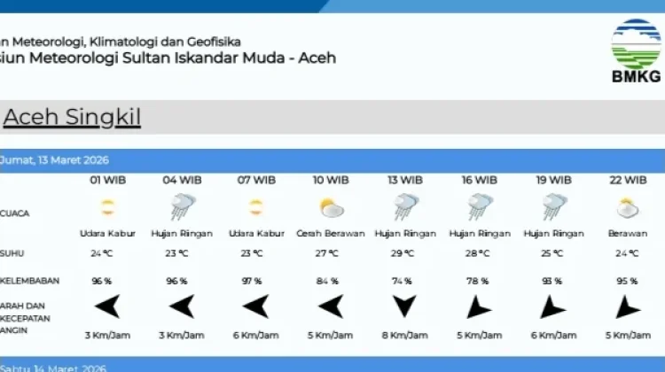 "Kami memprediksi sebagian besar cuaca di wilayah Aceh Singkil akan di warnai cerah berawan hingga memasuki sore hari di prediksi hujan ringan,"Jelas Nabila kepada RRI, Kamis 12 Maret 2026.