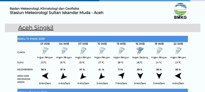 "Berdasarkan pantauan kami, Aceh Singkil dan sekitarnya berpotensi mengalami hujan ringan hingga sedang dari pagi, siang, sore, hingga malam hari. Masyarakat diharapkan tetap waspada dan menyiapkan perlengkapan hujan saat beraktivitas di luar rumah,"jelas Stya Juangga Dirta, Sabtu 14 Maret 2026.
