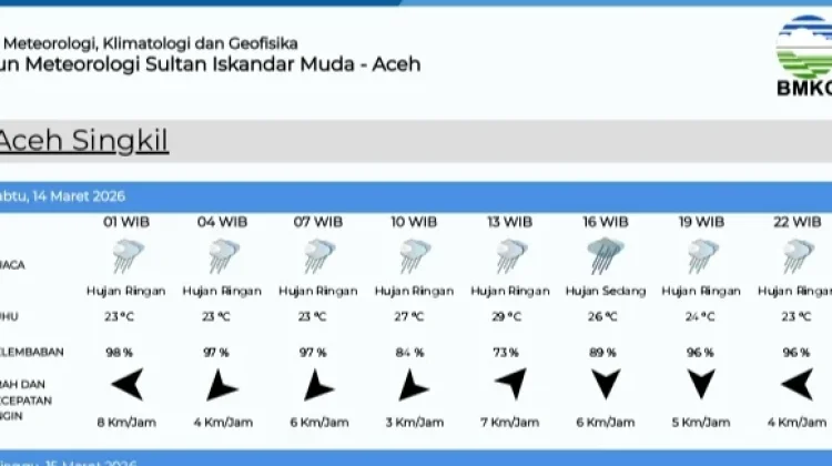 "Berdasarkan pantauan kami, Aceh Singkil dan sekitarnya berpotensi mengalami hujan ringan hingga sedang dari pagi, siang, sore, hingga malam hari. Masyarakat diharapkan tetap waspada dan menyiapkan perlengkapan hujan saat beraktivitas di luar rumah,"jelas Stya Juangga Dirta, Sabtu 14 Maret 2026.