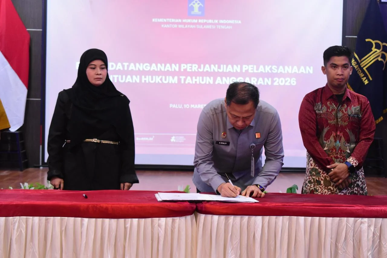 RRI.CO.ID, Palu : Kepala Kantor Wilayah Kementerian Hukum Sulawesi Tengah menandatangani perjanjian pelaksanaan bantuan hukum Tahun Anggaran 2026 bersama 18 Organisasi Pemberi Bantuan Hukum (OBH) terakreditasi se-Sulawesi Tengah. Kegiatan tersebut berlangsung di Aula Garuda Kanwil Kemenkum Sulteng di Palu, Selasa 10 Maret 2026.