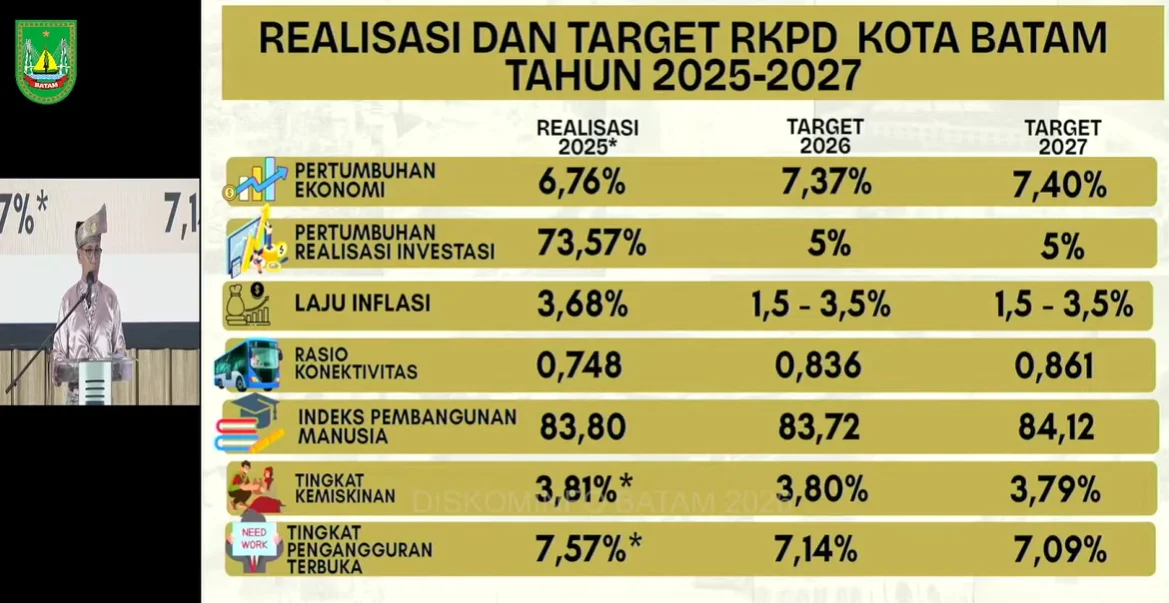 RRI.CO.ID, Batam - Kepala Bappeda Kota Batam Tri Wahyu Rubianto menyebutkan pertumbuhan ekonomi Batam menunjukkan kinerja yang cukup baik dalam beberapa tahun terakhir. Pemerintah Kota Batam menargetkan pertumbuhan ekonomi daerah terus meningkat hingga tahun 2027. Target tersebut disampaikan dalam Musrenbang RKPD tingkat Kota Batam tahun 2026.