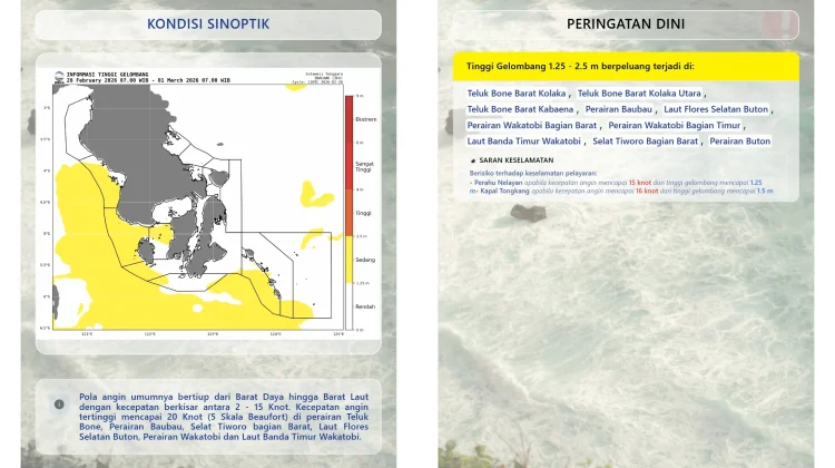 RRI.CO.ID, Baubau - Badan Meteorologi, Klimatologi dan Geofisika (BMKG) kembali merilis Prakiraan Tinggi Gelombang wilayah Sulawesi Tenggara (Sultra). Prakiraan tinggi gelombang ini berlaku sejak tanggal tanggal 28 Februari 2026 pukul 08.00 WITA - 01 Maret 2026 pukul 08.00 WITA.