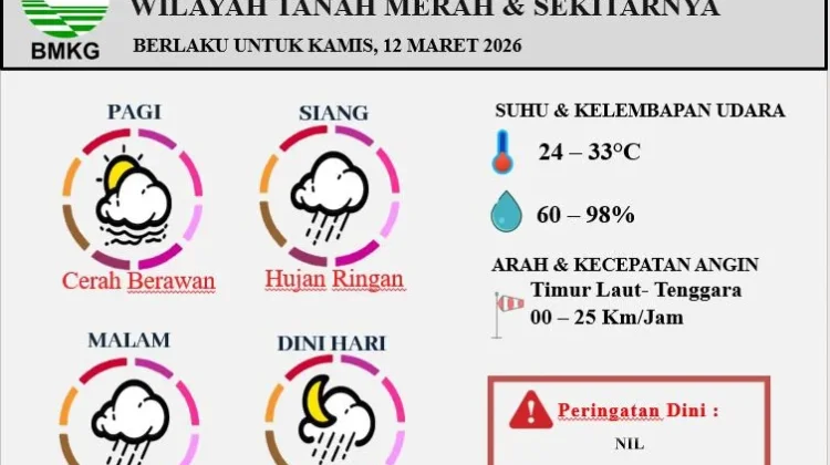 Prakiraan Cuaca Harian Wilayah Tanah Merqah dan Sekitarnya Periode 12 Maret 2026