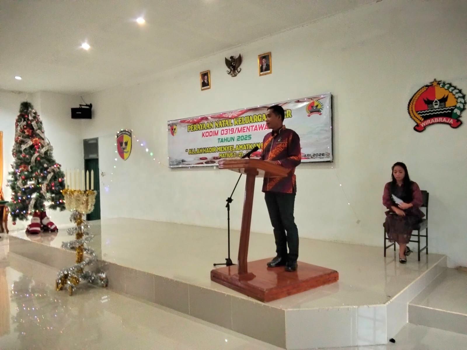 Setelah Ketua Panitia Natal Membuka sambutan, Dandim 0319/Mentawai memberikan sambutan dengan mengatakan Natal yang penuh damai ini Dengan mengangkat Tema: " Allah Hadir Menyelamatkan Keluarga " yang menekankan pentingnya peran keluarga sebagai fondasi pembentukan prajurit yang beriman, berkarakter dan berintegritas.