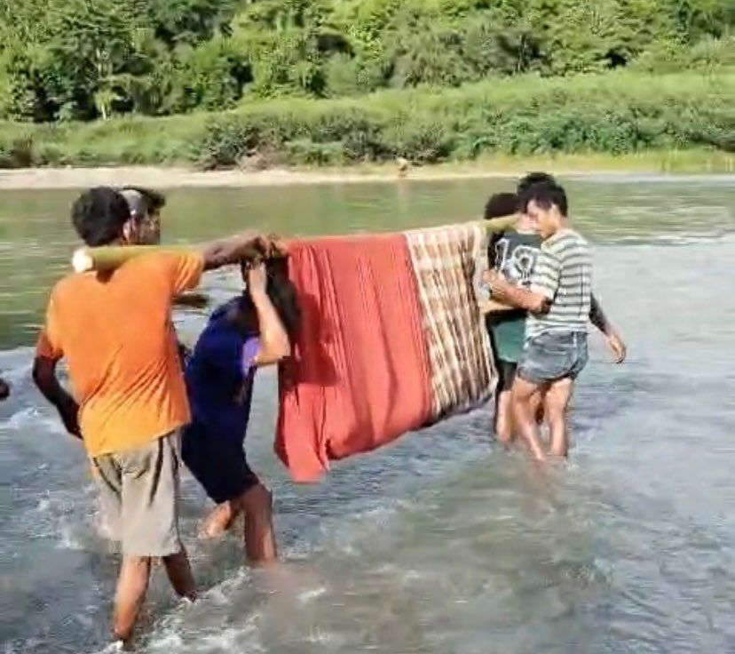 Dari kampung, warga kembali menandu korban sejauh kurang lebih dua kilometer menuju seberang sungai, tempat ambulans menunggu. Warga harus menuruni bukit dan menyeberangi sungai dengan ketinggian air sekitar selutut.