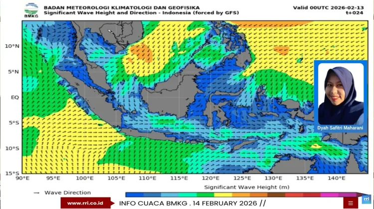 RRI.CO.ID, Kupang - Badan Meteorologi Klimatologi dan Geofisika (BMKG) Stasiun Meteorologi Tenau Kupang merilis prakiraan cuaca maritim untuk wilayah Nusa Tenggara Timur (NTT) yang berlaku Sabtu, 14 Februari 2026 pukul 08.00 WITA hingga Minggu, 15 Februari 2026 pukul 08.00 WITA. Informasi ini disampaikan guna memberikan peringatan dini kepada masyarakat pesisir dan pelaku pelayaran.