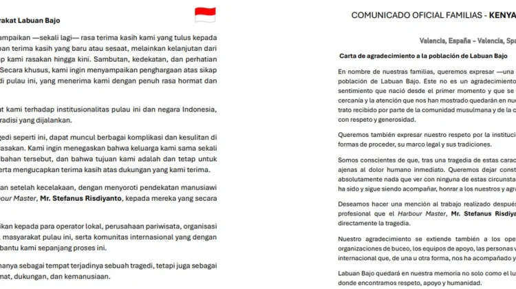 RRI.CO.ID, Manggarai Barat – Keluarga korban tragedi kecelakaan laut di Labuan Bajo menyampaikan surat terbuka berisi ucapan terima kasih kepada masyarakat Labuan Bajo atas dukungan dan empati yang diberikan sejak awal peristiwa hingga proses penanganan berlangsung.