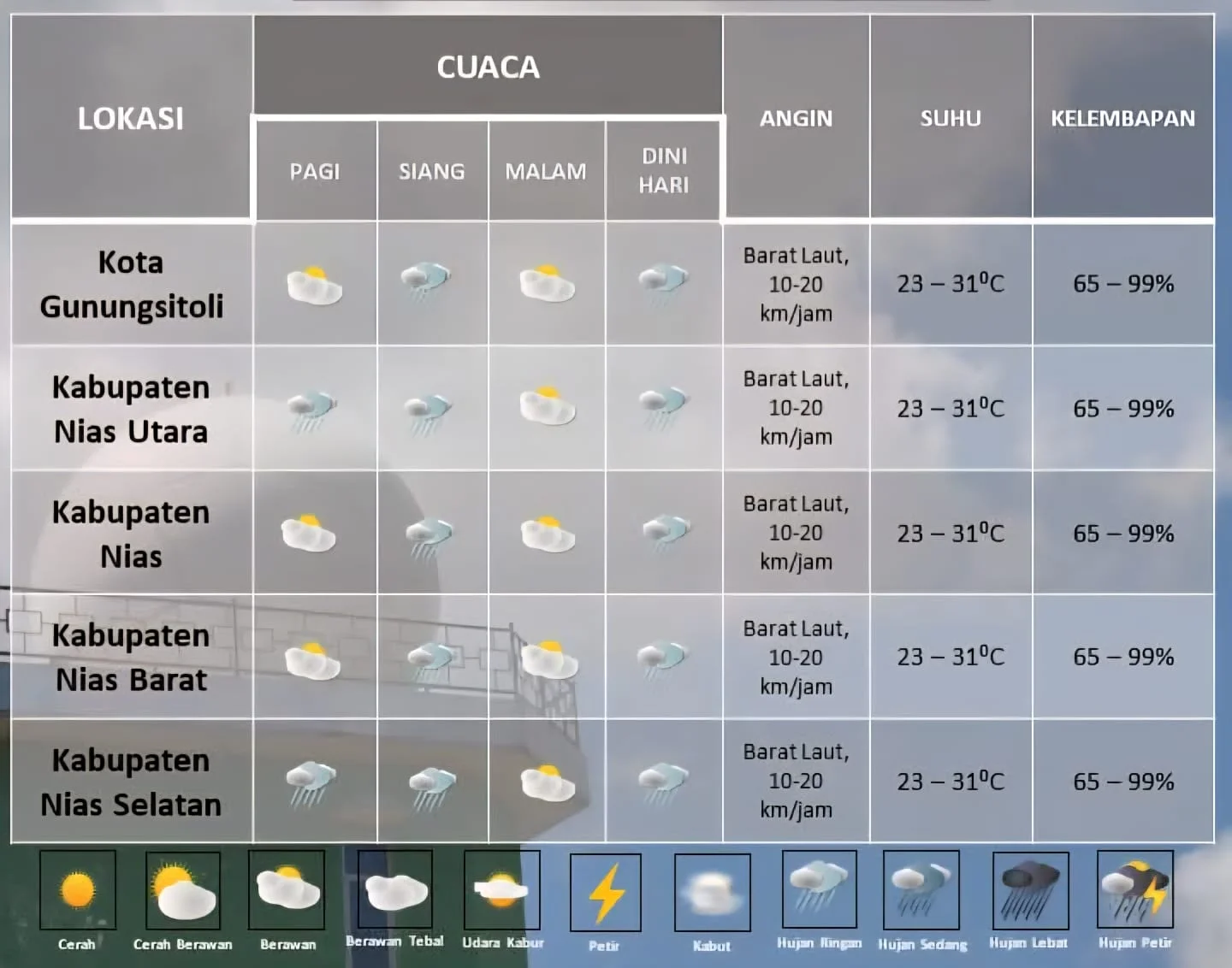 “Pagi hari berawan potensi hujan ringan untuk wilayah kabuapten Nias Utara dan Nias Selatan, siang-sore hari berawan potensi hujan ringan untuk wilayah kepulauan Nias, malam hari berawan serta dini hari berawan potensi hujan ringan untuk wilayah kepulauan Nias,” kata Humaidi.