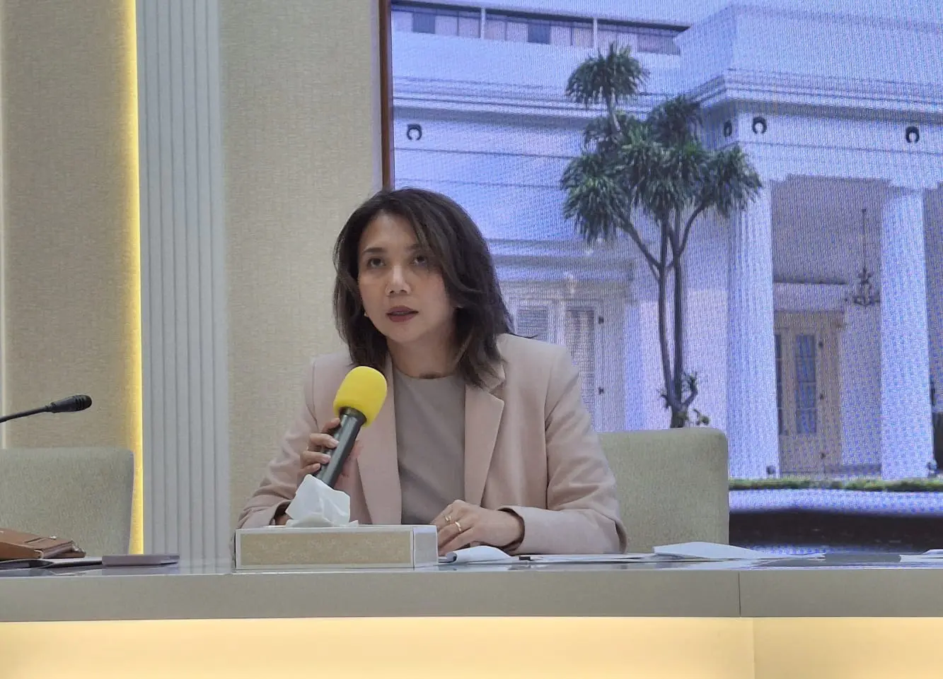 Jubir I Kemlu RI, Yvonne Mewengkang dalam press briefing Jumat, 13 Maret 2026, di Ruang Palapa, Kemlu RI, Jakarta (Foto: RRI/Retno Mandasari)