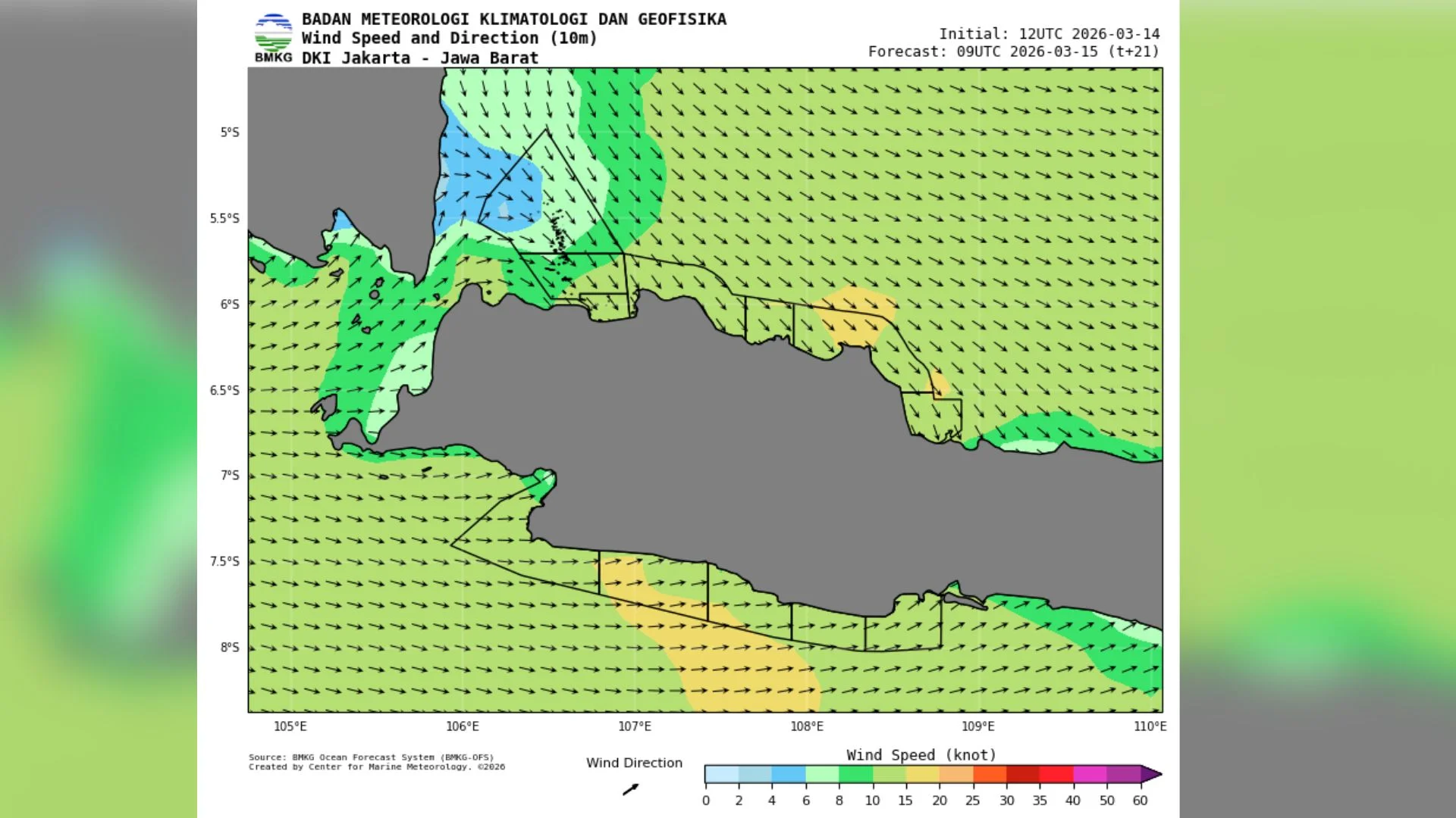 "Kondisi angin diprediksi bertiup dari arah barat daya hingga barat laut. Kecepatan angin maksimum mencapai 15 knot atau sekitar 28 kilometer per jam di Teluk Jakarta, perairan Kepulauan Seribu, dan perairan Cirebon," kata Laras dalam keterangan resmi.