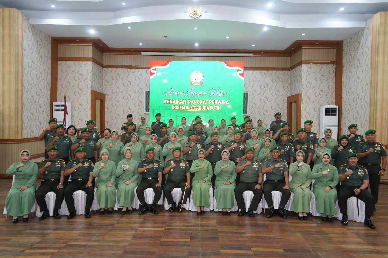 KBRN, Jambi : Pelaporan korp kenaikan pangkat perwira Korem 042/Gapu periode 1 Oktober 2025 dipimpin Danrem, Brigjen TNI Heri Purwanto. Perwira yang menerima kenaikan pangkat setingkat lebih tinggi sebanyak 59 orang (Kolonel 5 orang, Mayor 6 orang, Kapten 36 orang dan Lettu 12 orang).