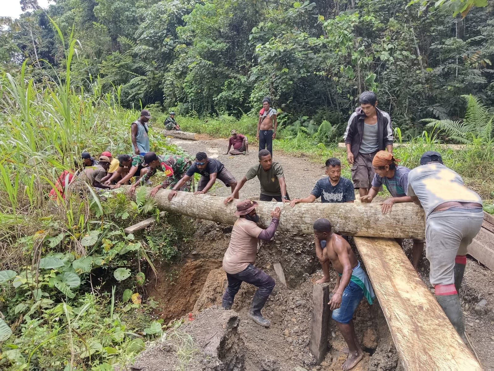 “Jembatan ini rusak parah dan sangat berisiko bagi warga yang melintas. Karena itu, kami bersama TNI dan masyarakat berinisiatif untuk bergotong royong memperbaikinya,” ujar Bripka Mathen Wayoi.