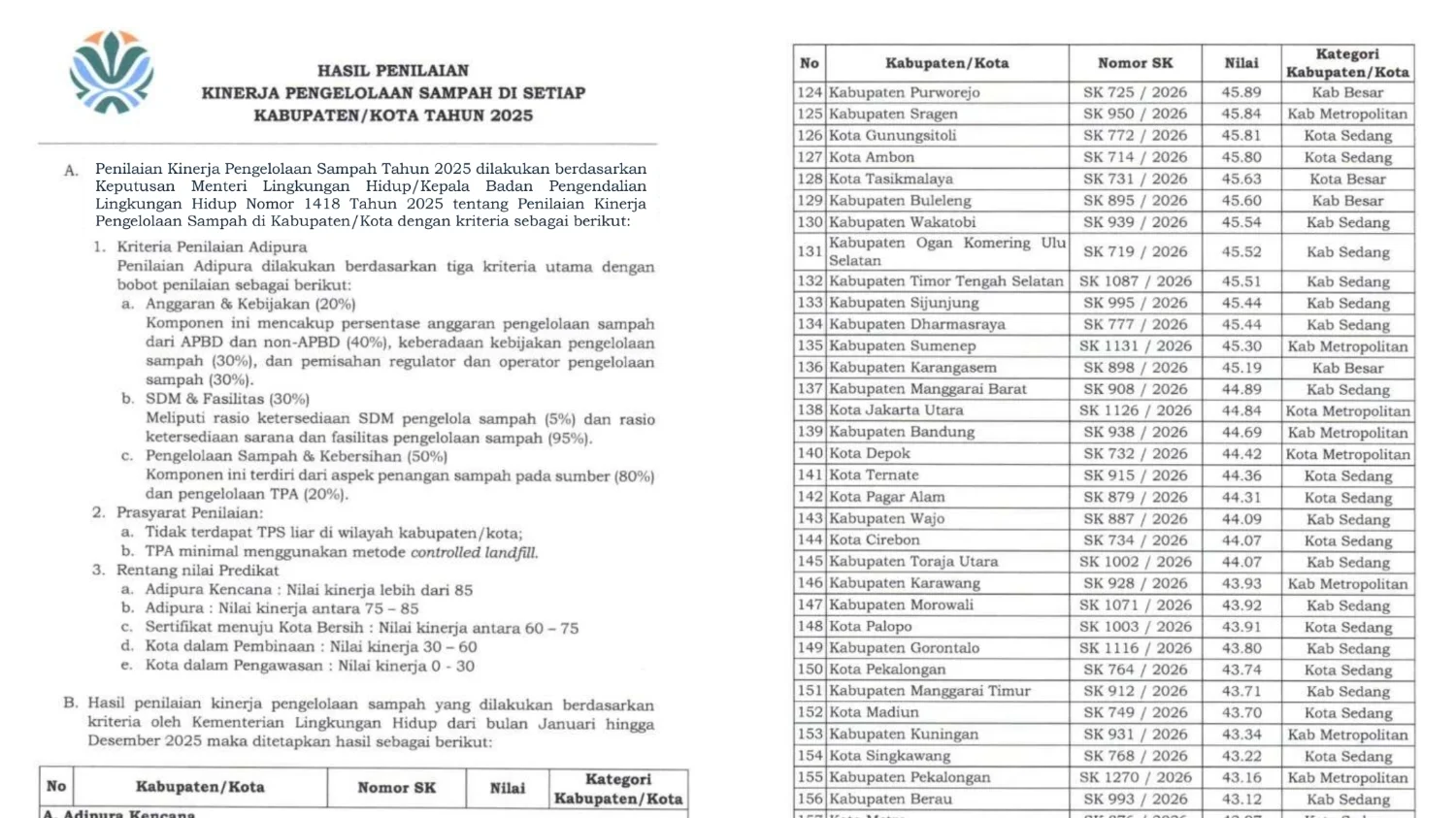 Penilaian kinerja ini dilaksanakan berdasarkan Keputusan Menteri Lingkungan Hidup/Kepala Badan Pengendalian Lingkungan Hidup Nomor 1418 Tahun 2026 tentang Penilaian Kinerja Pengelolaan Sampah di setiap Kabupaten/Kota. Evaluasi dilakukan sepanjang Januari hingga Desember 2025.