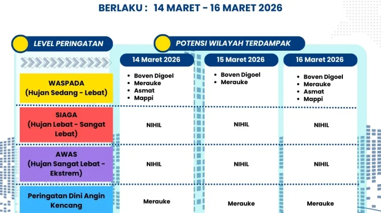 RRI.CO.ID, Merauke : Stasiun Meteorologi Kelas III Mopah Merauke mengupdate Peringatan Dini Cuaca 3 Harian Provinsi Papua Selatan (Kabupaten Asmat, Mappi, Boven Digoel dan Merauke), Jumat 13 Maret 2026. Peringatan Dini ini berlaku tiga hari, pada 14-16 Maret 2026. Untuk tanggal 14 Maret 2026 terdapat empat wilayah (Asmat, Mappi, Boven Digoel dan Merauke) yang berpotensi terdampak level Peringatan Waspada (hujan sedang hingga lebat) dan satu wilayah (Merauke) yang berpotensi terdampak level peringatan dini angin kencang. Sedangkan untuk Level Peringatan lainnya adalah Nihil, baik itu Level Siaga (hujan lebat hingga sangat lebat) dan Awas (hujan sangat lebat hingga ekstrem).