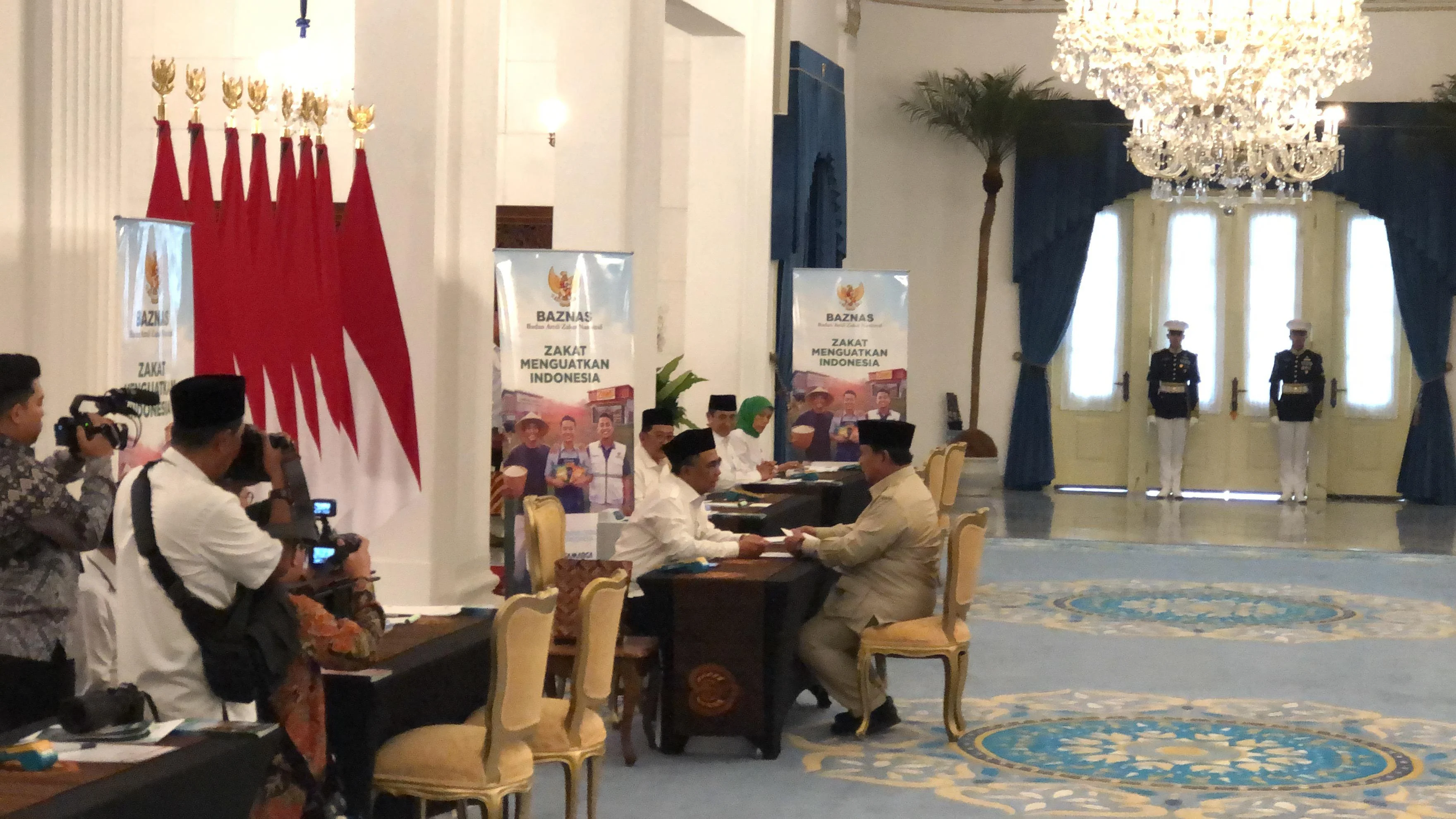 Presiden Prabowo mengenakan safari krem dan peci berwarna hitam. Presiden Prabowo menuju meja yang dipersiapkan Baznas untuk membayar zakat.