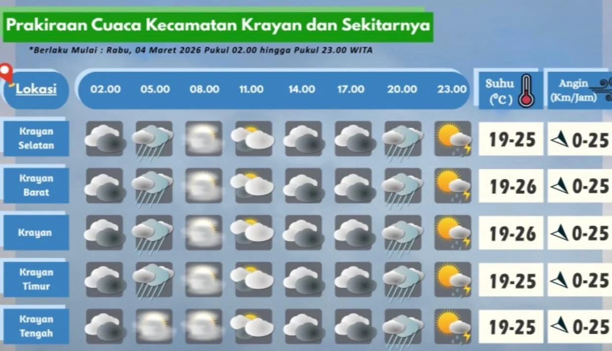 RRI.CO.ID, Nunukan: Badan Meteorologi, Klimatologi dan Geofisika Stamet Yuvai Semaring merilis prakiraan cuaca pada Rabu (4/3/2026).
