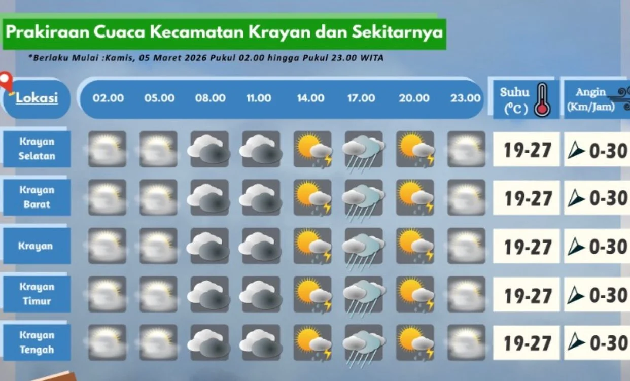 RRI.CO.ID, Nunukan: Badan Meteorologi, Klimatologi dan Geofisika Stamet Yuvai Semaring merilis prakiraan cuaca pada Kamis (5/3/2026).
