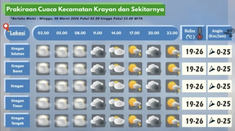 RRI.CO.ID, Nunukan: Badan Meteorologi, Klimatologi dan Geofisika Stamet Yuvai Semaring merilis prakiraan cuaca pada Minggu (8/3/2026).