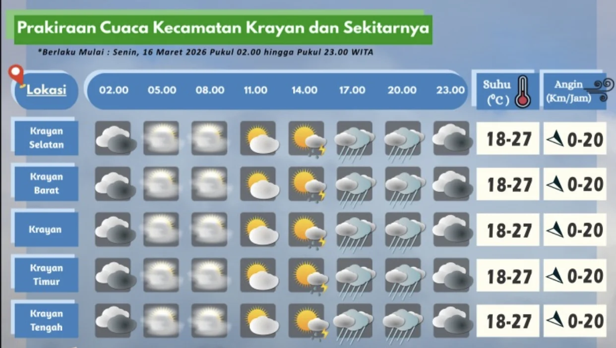 RRI.CO.ID, Nunukan: Badan Meteorologi, Klimatologi dan Geofisika Stamet Yuvai Semaring merilis prakiraan cuaca pada Senin (16/3/2026).