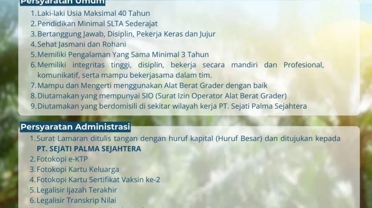 RRI.CO.ID, Muba - PT Sejati Palma Sejahtera membuka lowongan kerja Operator Grader untuk tenaga kerja lokal. Perusahaan memprioritaskan pelamar yang berdomisili di wilayah Musi Banyuasin.