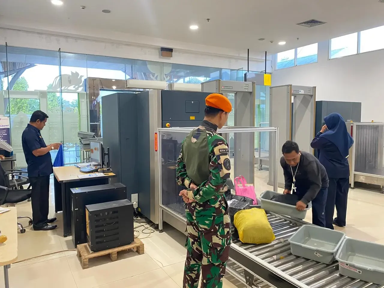 Di terminal keberangkatan, personel Satgas tampak bersiaga mendampingi pemeriksaan di pos Security Check Point (SCP) secara ketat dan terukur. Setiap barang bawaan penumpang yang melewati mesin X-Ray diawasi cermat guna memastikan tidak ada benda terlarang masuk kabin pesawat.