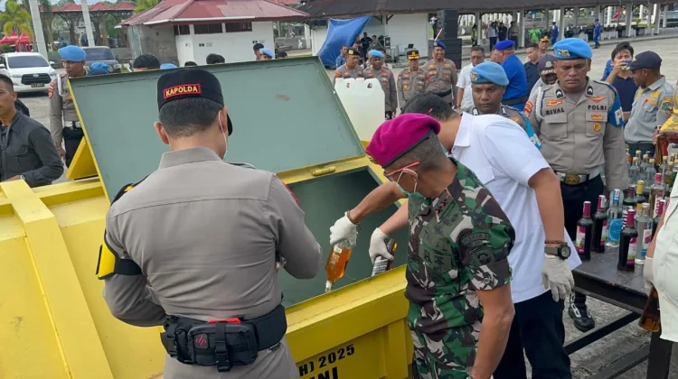 Selain apel gelar pasukan, kegiatan tersebut juga dirangkaikan dengan pemusnahan minuman keras hasil sitaan aparat sebagai bentuk komitmen bersama dalam menjaga situasi keamanan dan ketertiban masyarakat menjelang Hari Raya Idulfitri.