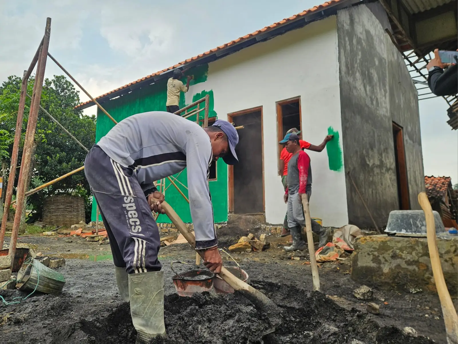 Sejak pagi hari, prajurit TNI dan warga desa terlihat bergotong royong di berbagai titik pembangunan. Ada yang mengaduk semen, ada yang mengangkat batu, sementara yang lain membantu menyiapkan bahan bangunan.