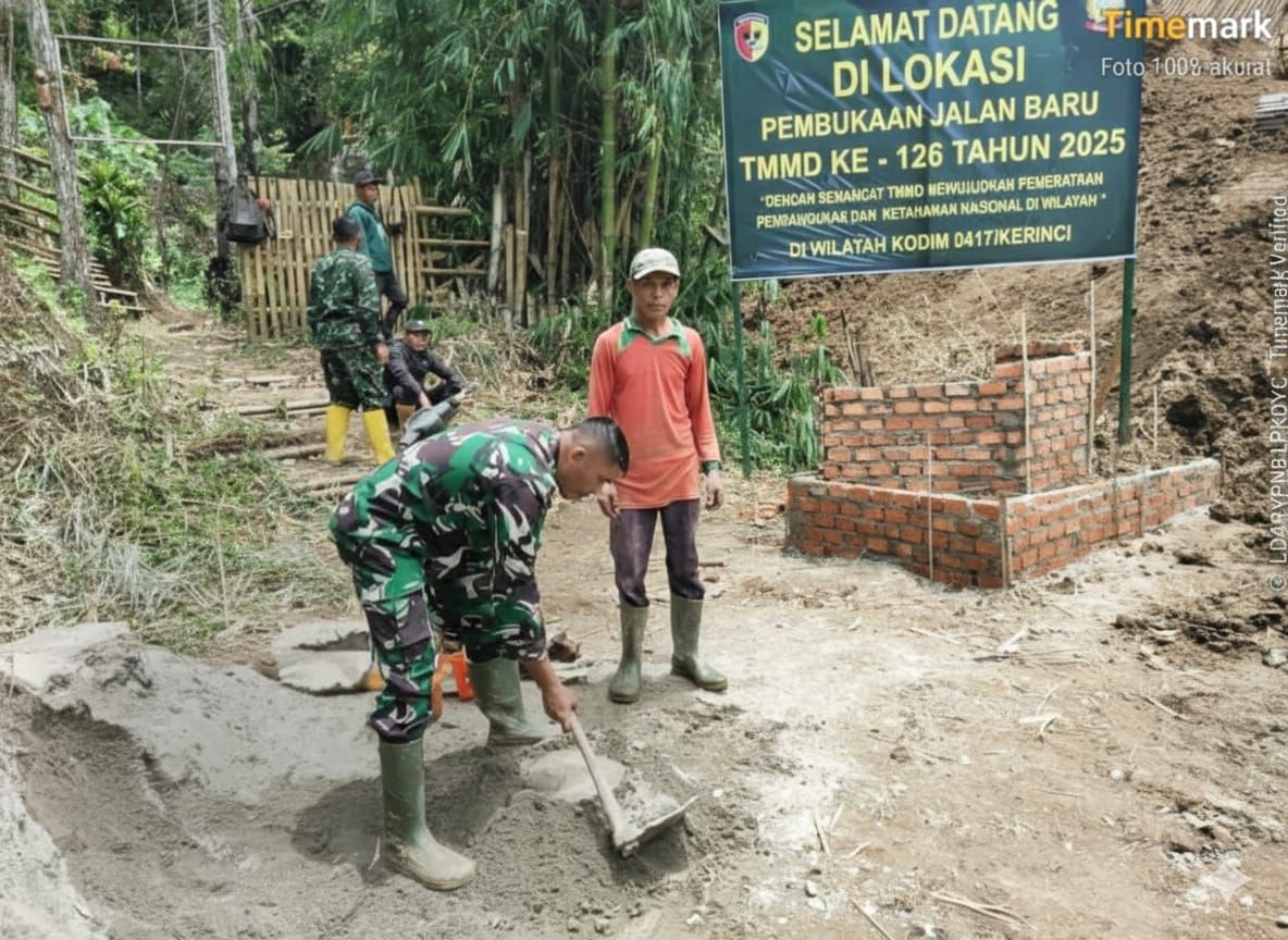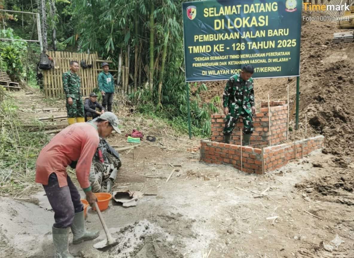 KBRN, Sungai Penuh: Menjelang penutupan program TNI Manunggal Membangun Desa (TMMD) Reguler ke-126 Kodim 0417/Kerinci yang tinggal beberapa hari lagi, proses pembangunan prasasti resmi TMMD mulai dilaksanakan. Pembangunan prasasti yang terletak di titik nol pembukaan jalan baru ini menjadi simbol sejarah pelaksanaan TMMD di Desa Sungai Jernih, Kecamatan Pondok Tinggi, Kota Sungai Penuh, Minggu (26/10/2025).