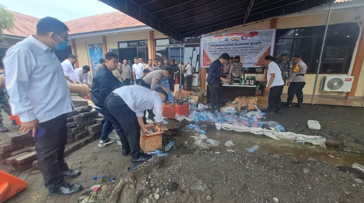 Adapun pemusnahan barang bukti antara lain, 2525 liter minuman jenis captikus, 259 botol ukuran 620 mil minol golongan A merek Valetine, 46 botol ukuran 325 mil minol golongan A merek mines, 24 botol ukuran 420 minol golongan A merek Bir bintang, 20 botol ukuran 600 Kasegaran, 27 botol ukuran 750 mil minol golongan C merek Tanduay, dan 690 butir obat keras yang mengandung trieksil penidil.(Jumel)