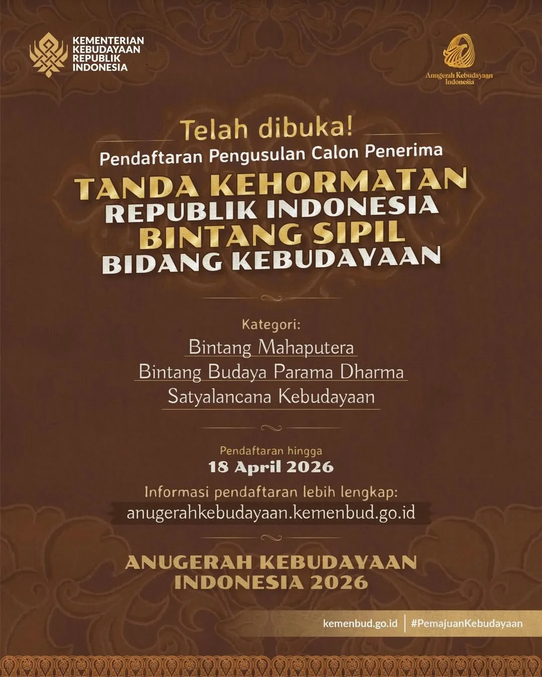 Program ini menjadi bentuk penghargaan negara kepada individu-individu yang telah menunjukkan dedikasi, kontribusi, serta pengabdian luar biasa dalam memajukan kebudayaan Indonesia. Pengusulan dibuka mulai 20 Februari hingga 18 April 2026.