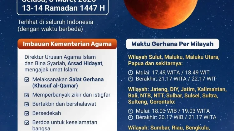 RRI.CO.ID, Jakarta: Kementerian Agama Republik Indonesia mengimbau umat Islam untuk melaksanakan Salat Gerhana (Khusuf al-Qamar) saat fenomena Gerhana Bulan Total yang terjadi pada Selasa, 3 Maret 2026 atau bertepatan dengan 13–14 Ramadan 1447 Hijriah.