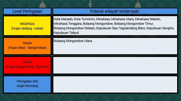 Dari edaran peringatan Dini tersebut disampaikan peringatan ini agar diwaspadai hujan intensitas sedang hingga intensitas lebat, disertai petir dan angin kencang, berpeluang terjadi dihampir seluruh wilayah Sulawesi Utara.