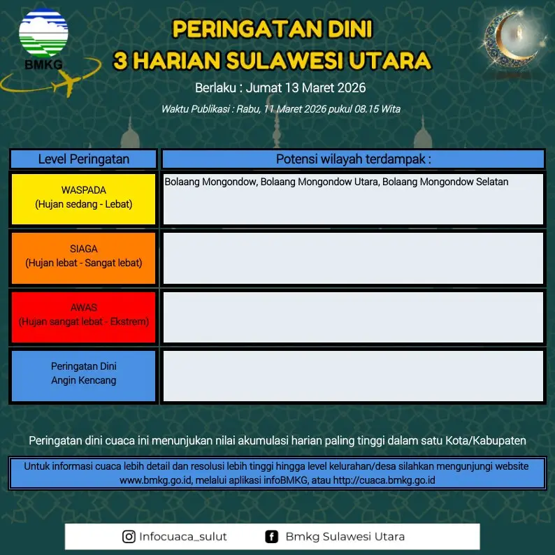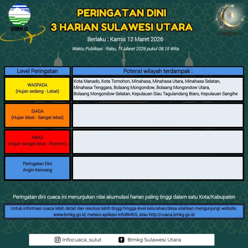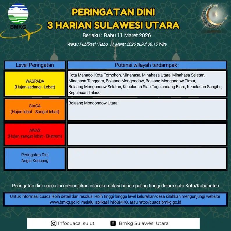 RRI.CO.ID, Manado - BMKG Sulut keluarkan Peringatan Dini Cuaca selama 3 harian dari tanggal 11 Maret 2026 sampai 13 Maret 2026.