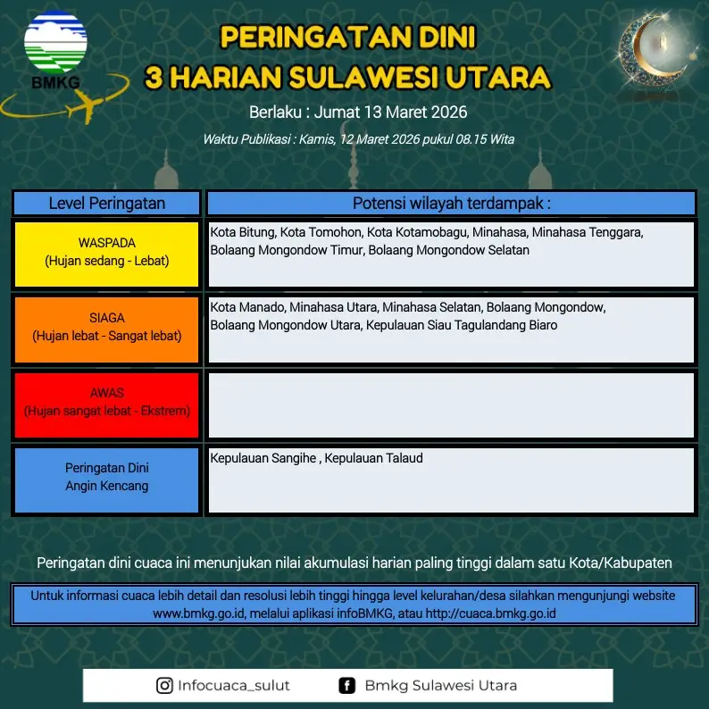 RRI.CO.ID, Manado - BMKG Sulut keluarkan Peringatan Dini Cuaca selama 3 harian dari tanggal 12 Maret 2026 sampai 14 Maret 2026.