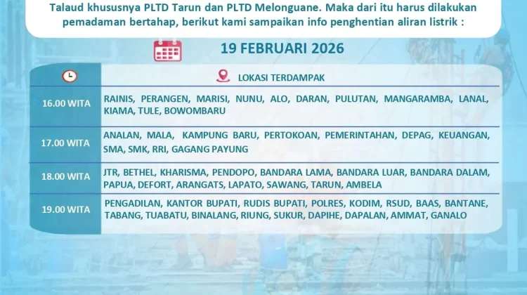 RRI.CO.ID, Talaud - PT PLN ULP Melonguane terpaksa memberlakukan pemadaman listrik bertahap di wilayah Kabupaten Kepulauan Talaud pada hari ini, Kamis, 19 Februari 2026. Kebijakan ini diambil menyusul adanya kendala operasional akibat cuaca ekstrem dan kerusakan mesin pada kapal pengangkut bahan bakar minyak MT QOWWIY yang menuju PLTD Tarun dan PLTD Melonguane.