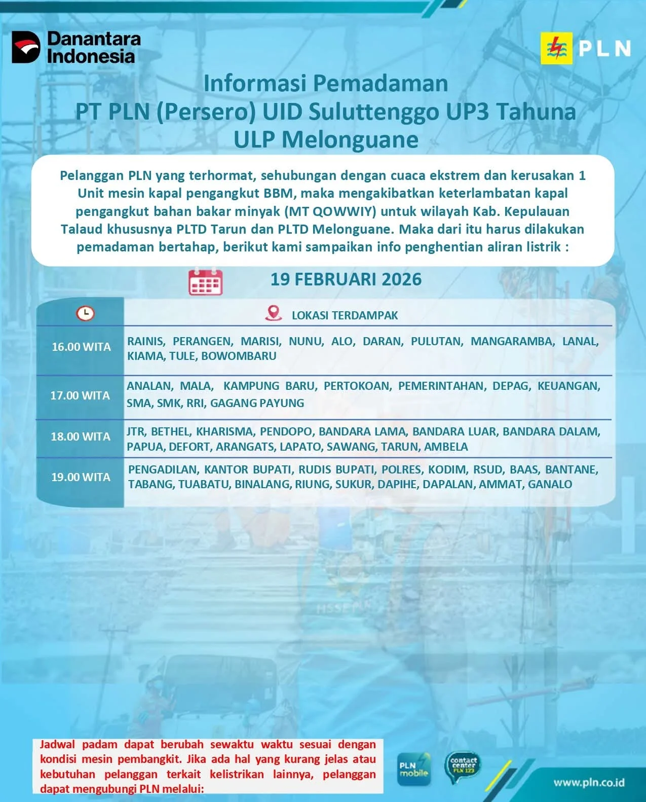 RRI.CO.ID, Talaud - PT PLN ULP Melonguane terpaksa memberlakukan pemadaman listrik bertahap di wilayah Kabupaten Kepulauan Talaud pada hari ini, Kamis, 19 Februari 2026. Kebijakan ini diambil menyusul adanya kendala operasional akibat cuaca ekstrem dan kerusakan mesin pada kapal pengangkut bahan bakar minyak MT QOWWIY yang menuju PLTD Tarun dan PLTD Melonguane.