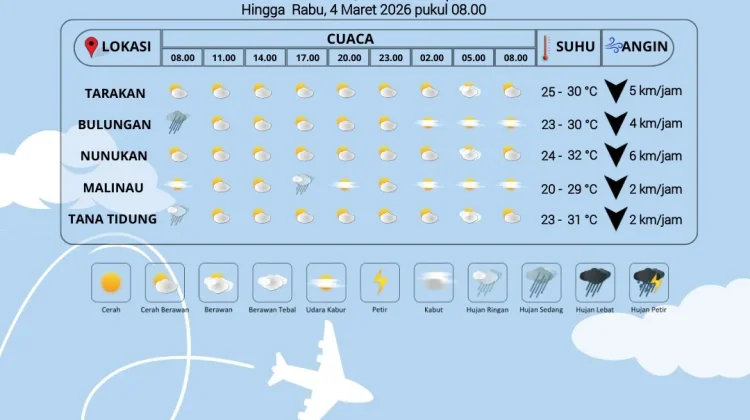 RRI.CO.ID, Tarakan - Badan Meteorologi, Klimatologi dan Geofisika (BMKG) melalui Stasiun Meteorologi Kelas III Juwata Tarakan merilis prakiraan cuaca wilayah Kalimantan Utara yang berlaku mulai selasa (3/3/2026) hingga rabu (4/3/2026).