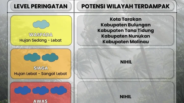 Pada kamis (5/3/2026), tidak terdapat wilayah di Kalimantan Utara yang masuk dalam kategori terdampak cuaca ekstrem.